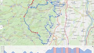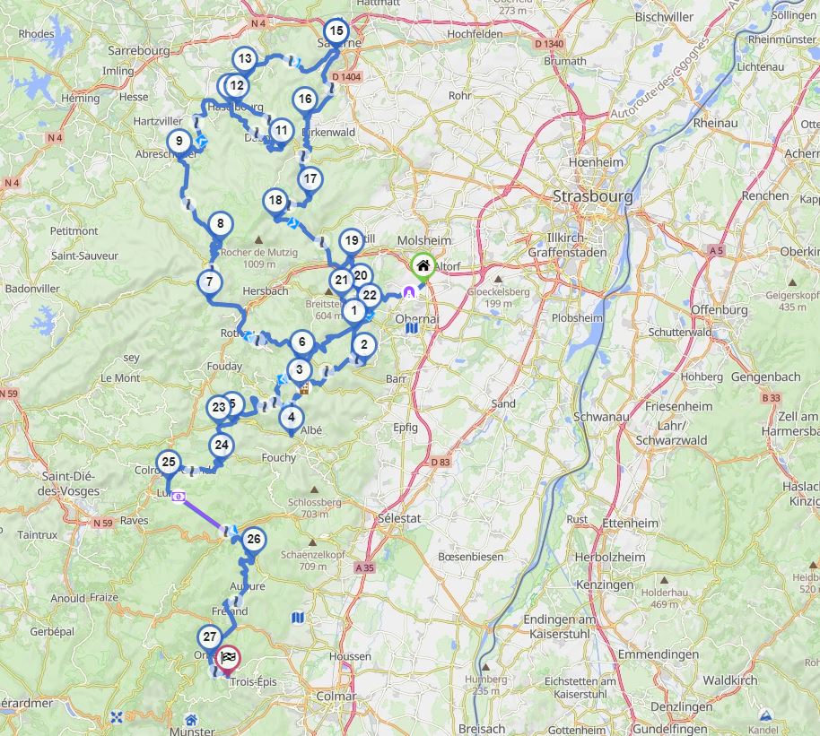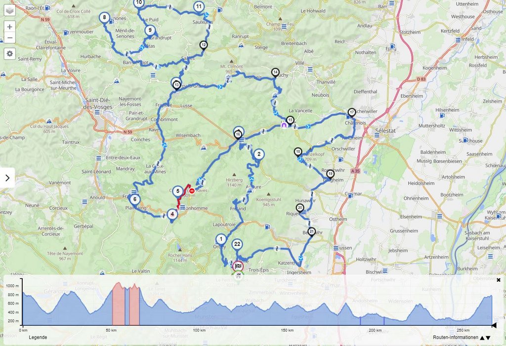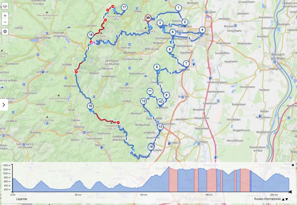 | Verlauf: | Rosheim (FR) - Kloster Hohenburg / Breitenbach / Col de la Charbonnière/ KZ Natzweiler-Struthof / Schirmeck / Col du Donon / Col de la Côte de l'Engin / Saint Leon / Haselbourg / Saverne / Ruines du Nideck / Col Haut de Ribeauvillé / Orbey / Labaroche |